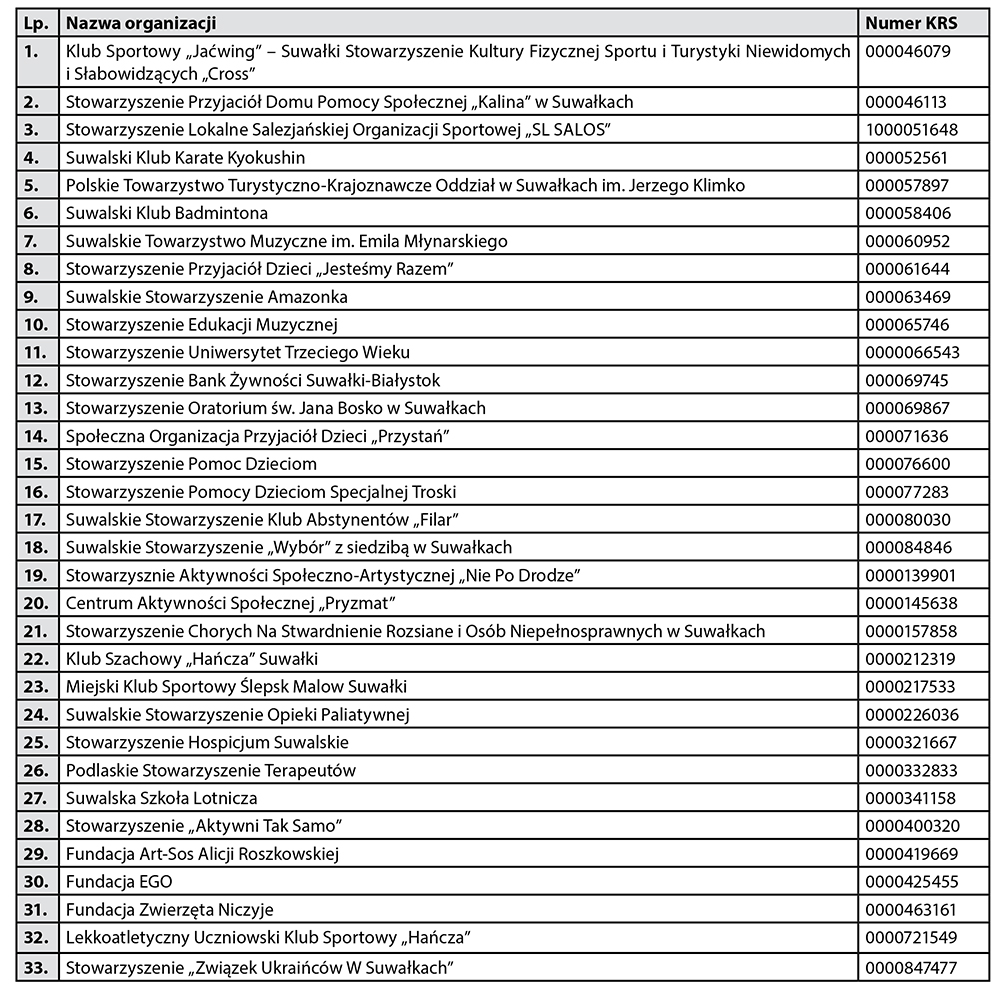 Poniżej przedstawiamy wykaz suwalskich organizacji pożytku publicznego, na które można przekazać 1,5% należnego podatku. Organizacje te prowadzą szereg społecznie użytecznych działań na rzecz mieszkańców Suwałk w zakresie pomocy społecznej, ochrony zdrowia, edukacji, organizacji wypoczynku, sportu i kultury. Zachęcamy do przekazywania 1,5% należnego podatku dla suwalskich organizacji pożytku publicznego.