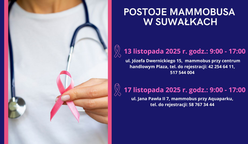 • 17.11.2025 godz.: 9:00 – 17:00, Suwałki, ul. Jana Pawła II 7, mammobus przy Aquaparku, tel. do rejestracji: 58 767 34 44