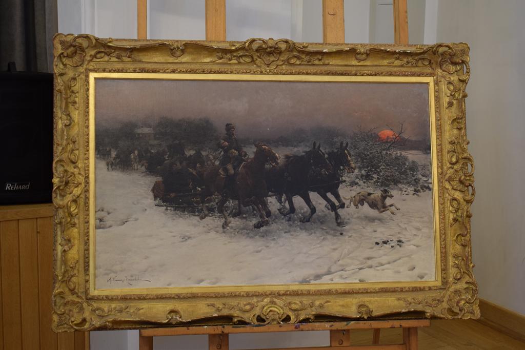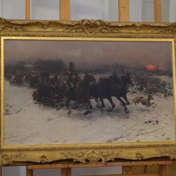 – Obraz trafił do Polski kilkanaście lat temu, wcześniej był w Europie, najprawdopodobniej został sprzedany prosto z pracowni Alfreda Wierusza-Kowalskiego, nie znane są jego późniejsze losy, czy wędrował od kolekcjonera do kolekcjonera, czy być może cały czas był w jednym miejscu, w jednej rodzinie. Na początku lat dwudziestych trafił do Polski, do kolekcjonera, który go zakupił w domu aukcyjnym. Jest to obraz, który nie był nigdy reprodukowany w prasie. Jest to obraz, który powstał w latach 80-tych, uznaje się, że były to najlepsze lata w twórczości artysty, później stworzył kilka obrazów bardzo pięknych i wyjątkowych, to ten czas uchodzi za szczytowy w twórczości malarza. Dla suwalskiego Muzeum, obraz ten będzie bardzo ważnym w kolekcji. Mamy wilki, ale ten jest bardziej dekoracyjny, ekspansywny, piękniejszy, przez to, ze jest malowniczy zachód słońca, i poprzez swoją ekspresję, dynamikę, która w tym obrazie jest zawarta. Jest to obraz, który nosi bardzo wiele cech dojrzałej, pełnej, spełnionej twórczości Alfreda Wiersza-Kowalskiego, czyli skróty perspektywiczne, dynamiczność. To obraz absolutnie z najwyższej półki twórczości malarza, jest to jeden z najbardziej pięknych, urokliwych, nastrojowych, który podoba się wszystkim. Teraz czekamy na decyzję konserwatora, ponieważ rama wymaga drobnych zabiegów. Jak najszybciej obraz trafi na galerię, ma już swoje miejsce, wiemy gdzie będzie eksponowany – dodaje Eliza Ptaszyńska.