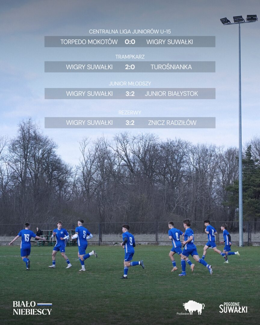 Juniorzy suwalskich Wigier do lat 15 wywalczyli drugi punkt w Centralnej Lidze Juniorów. W Warszawie bezbramkowo zremisowali z Torpedo Mokotów. Kolejny mecz rozegrają 18 kwietnia w samo południe w Suwałkach z Widzewem Łódź.