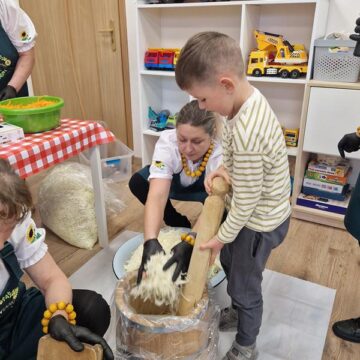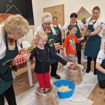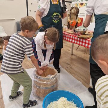 Jedną z głównych atrakcji był pokaz kiszenia kapusty w wykonaniu pań z Koła Gospodyń Wiejskich ,Rakowianki”. Dzieci mogły z bliska przyjrzeć się, jak wyglądał ten tradycyjny proces – z drewnianą beczką, ręcznym szatkowaniem kapusty i starannym ugniataniem. Gospodynie chętnie dzieliły się swoją wiedzą i doświadczeniem, zachęcając najmłodszych do poznawania i pielęgnowania regionalnych zwyczajów. Całe wydarzenie dopełniała wyjątkowa oprawa – na przedszkolnym korytarzu stanął jesienny stragan, pełen domowych przetworów: konfitur, ogórków, kompotów, a także świeżych warzyw i owoców. Całość dekorowały kłosy zbóż, dynie oraz snopki słomy, tworząc niepowtarzalny, sielski klimat.