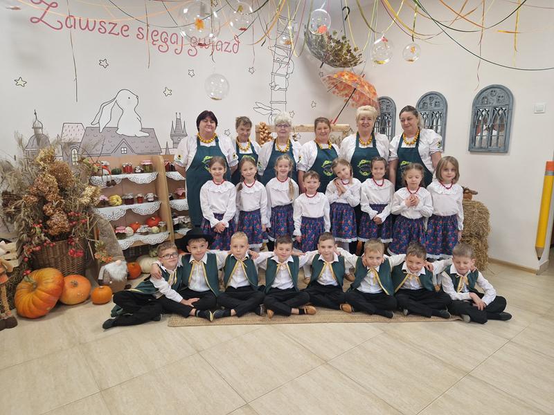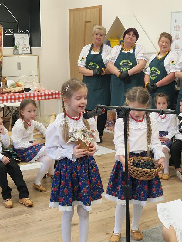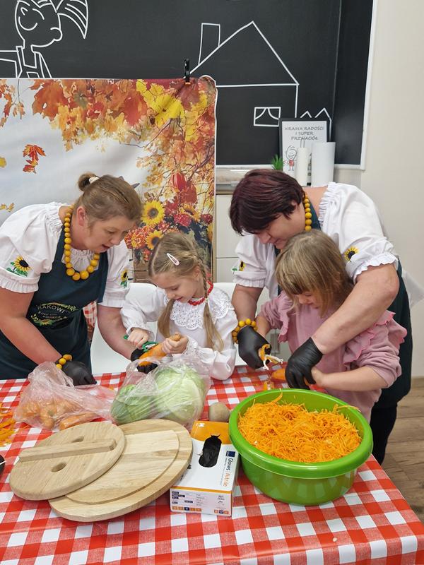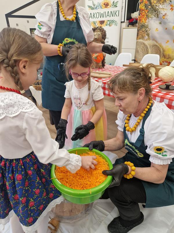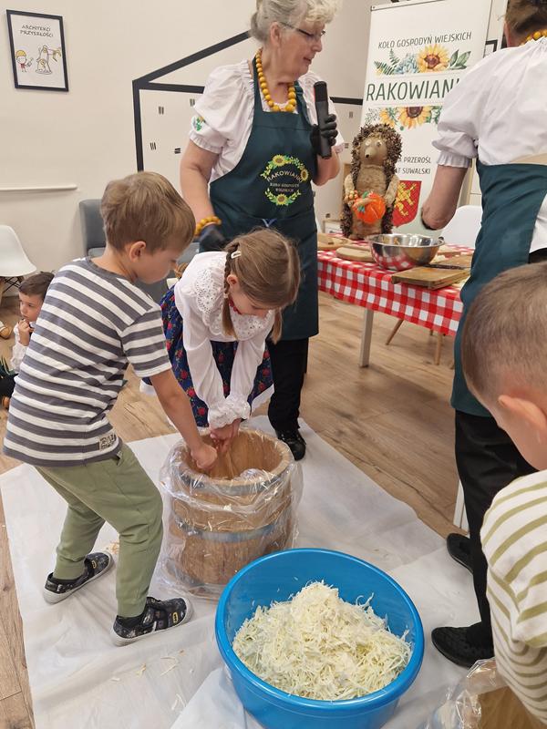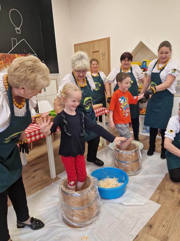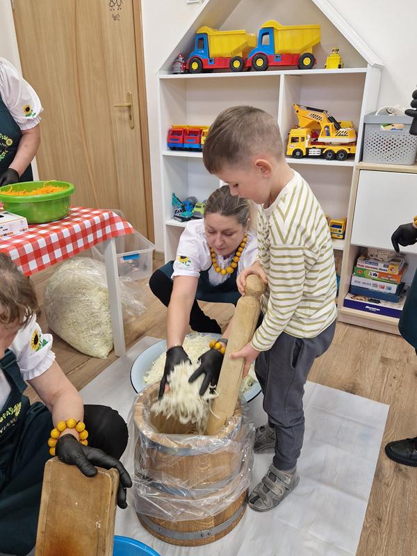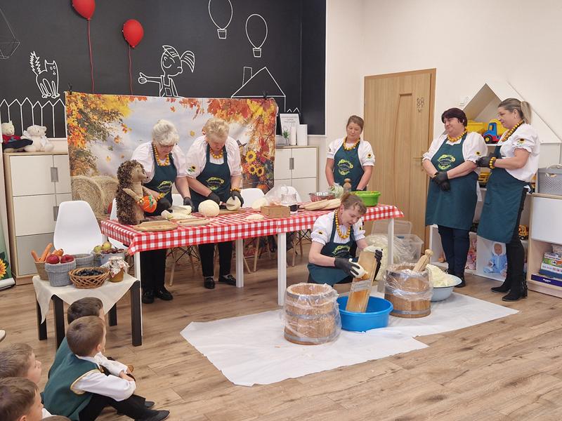 Jedną z głównych atrakcji był pokaz kiszenia kapusty w wykonaniu pań z Koła Gospodyń Wiejskich ,Rakowianki”. Dzieci mogły z bliska przyjrzeć się, jak wyglądał ten tradycyjny proces – z drewnianą beczką, ręcznym szatkowaniem kapusty i starannym ugniataniem. Gospodynie chętnie dzieliły się swoją wiedzą i doświadczeniem, zachęcając najmłodszych do poznawania i pielęgnowania regionalnych zwyczajów. Całe wydarzenie dopełniała wyjątkowa oprawa – na przedszkolnym korytarzu stanął jesienny stragan, pełen domowych przetworów: konfitur, ogórków, kompotów, a także świeżych warzyw i owoców. Całość dekorowały kłosy zbóż, dynie oraz snopki słomy, tworząc niepowtarzalny, sielski klimat.