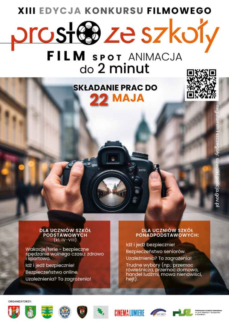 Komenda Miejska Policji w Suwałkach ogłasza konkurs filmowy „Prosto ze szkoły”. Zapraszamy uczniów do nagrania materiału filmowego, promującego: zdrowy styl życia bez środków uzależniających lub bezpieczne zachowania w codziennym życiu. Prace konkursowe należy dostarczyć do suwalskiej Policji, do dnia 22 maja 2026 roku.