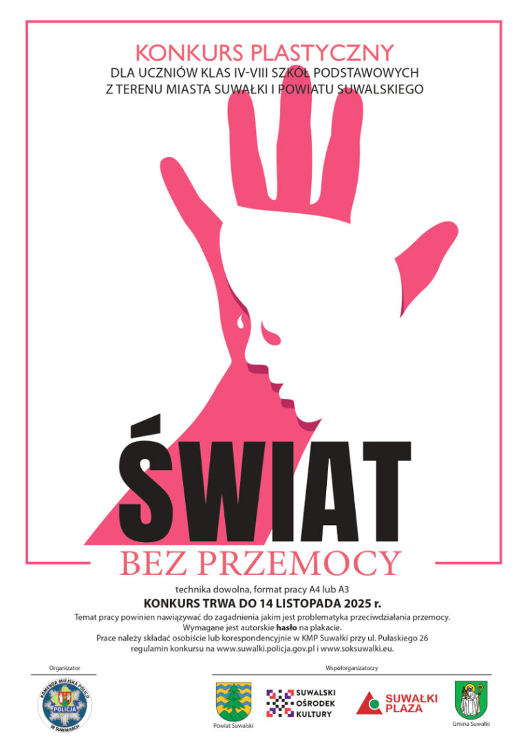 Wydział Prewencji Komendy Miejskiej Policji w Suwałkach wraz ze współorganizatorami: Suwalskim Ośrodkiem Kultury, Starostwem Powiatowym w Suwałkach, Gminą Suwałki oraz CH Suwałki Plaza zapraszają uczniów szkół podstawowych z miasta Suwałk i powiatu suwalskiego klas IV – VIII do udziału w konkursie plastycznym „Świat bez przemocy”.