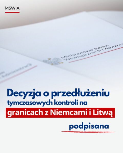 Minister Spraw Wewnętrznych i Administracji podpisał rozporządzenie w sprawie przedłużenia tymczasowej kontroli granicznej na granicy z Niemcami i Litwą. Wejdzie ono w życie 5 października br. i przedłuży kontrole o kolejne pół roku – do 4 kwietnia 2026 r.