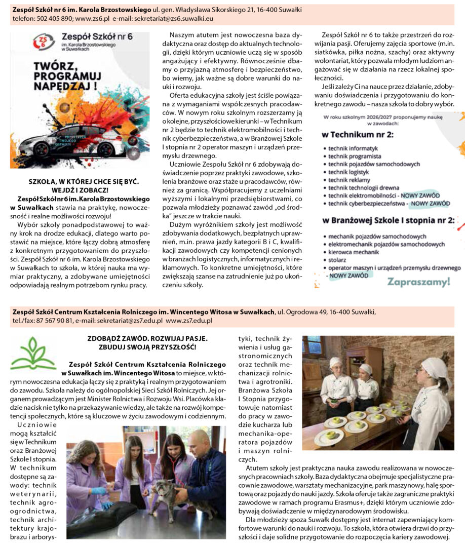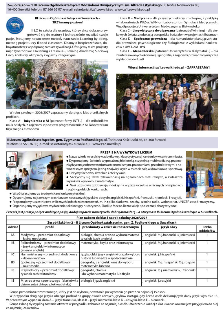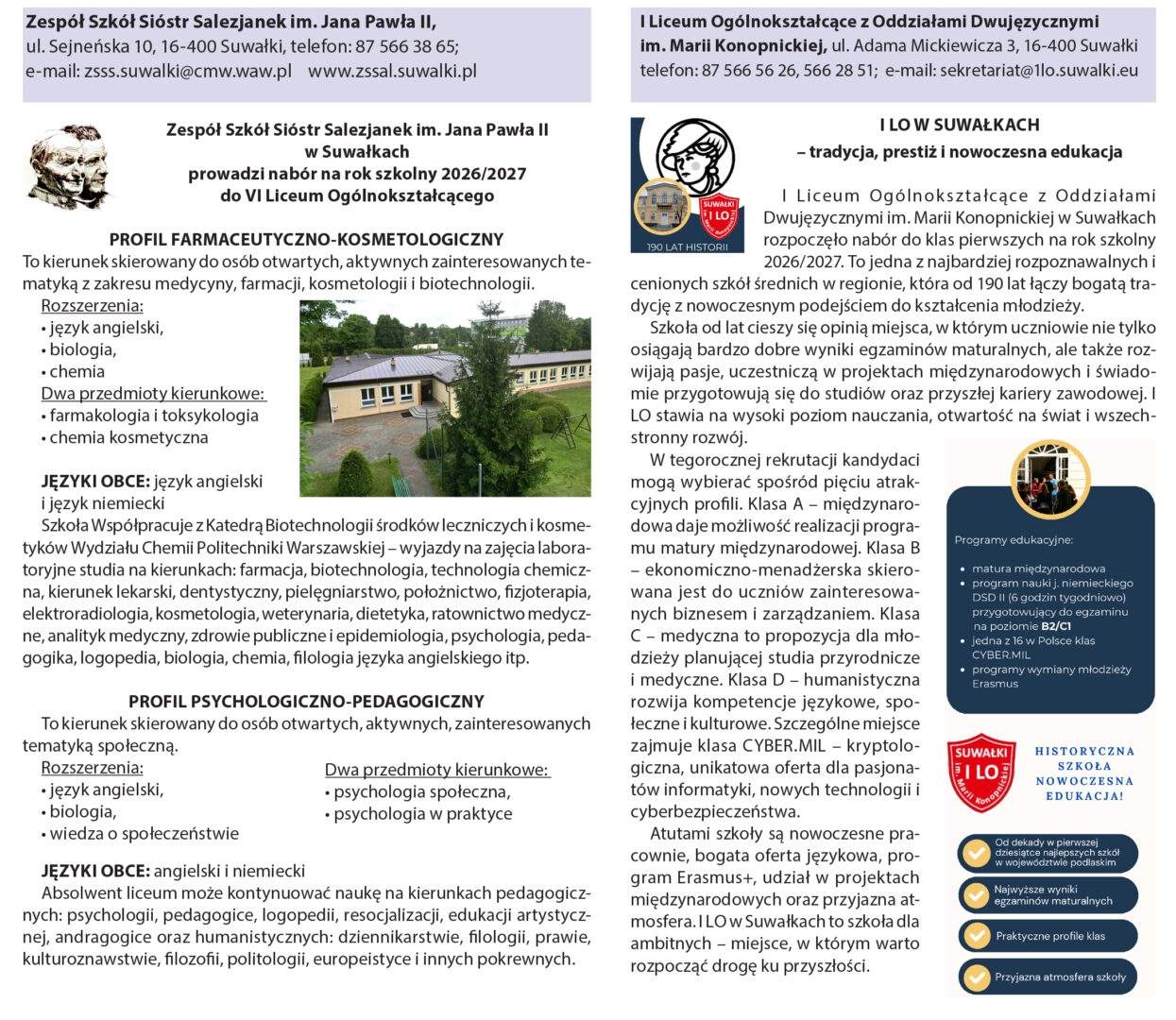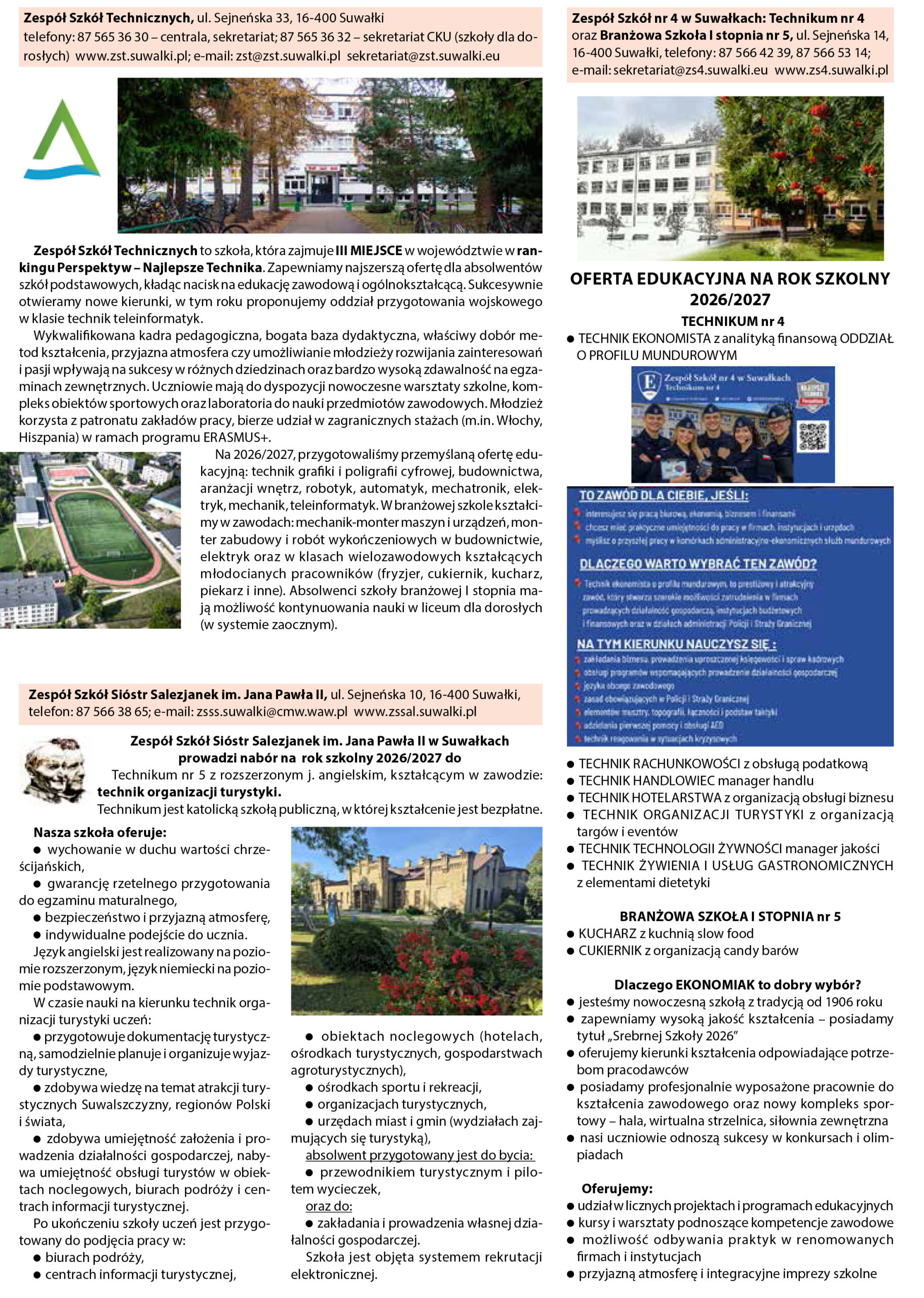 Niedługo rozpocznie się nabór do suwalskich szkół ponadpodstawowych na rok szkolny 2026/27. Terminy rekrutacji ogłosiła Podlaska Kurator Oświaty. Wnioski o przyjęcie do szkół ponadpodstawowych będzie można składać od 11 maja do 13 czerwca. Do szkół i oddziałów dwujęzycznych, oddziałów międzynarodowych, oddziałów przygotowania wojskowego, oddziałów wymagających od kandydatów szczególnych indywidualnych predyspozycji oraz do szkół i oddziałów prowadzących szkolenie sportowe wnioski będzie można składać od 11 do 27 maja. Przed suwalskimi nastolatkami i ich rodzicami jeszcze kilka tygodni na podjęcie tej ważnej decyzji. Właściwy wybór szkoły, a potem studiów, to większa szansa na sukces zawodowy. Ten wybór powinien być dostosowany do zainteresowań oraz możliwości nastolatka. „DwuTygodnik Suwalski” przygotował krótki informator o ofercie suwalskich szkół średnich na podstawie materiałów otrzymanych z tych szkół.