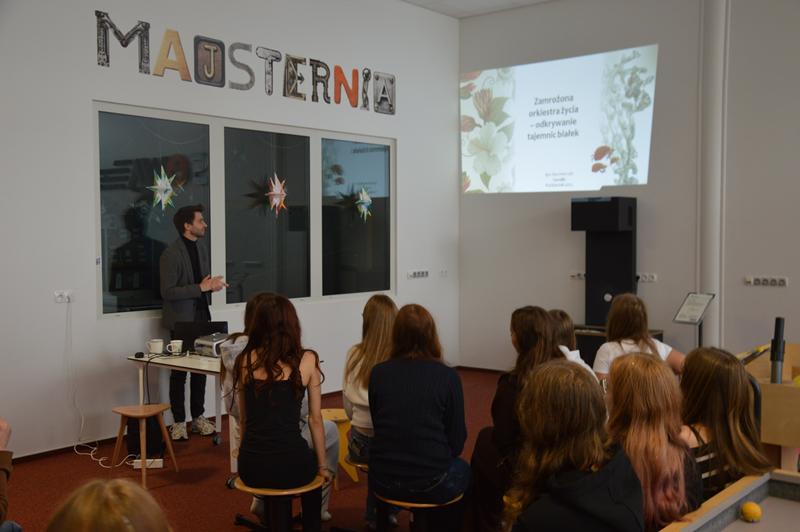 Doktorant w Małopolskim Centrum Biotechnologii Uniwersytetu Jagiellońskiego Igor Kaczmarczyk opowiadał o białkach. Podczas spotkania uczestnicy dowiedzieli się m.in.: czy białka są białe; po co obserwować białka i jak to robić oraz za co białka są odpowiedzialne?