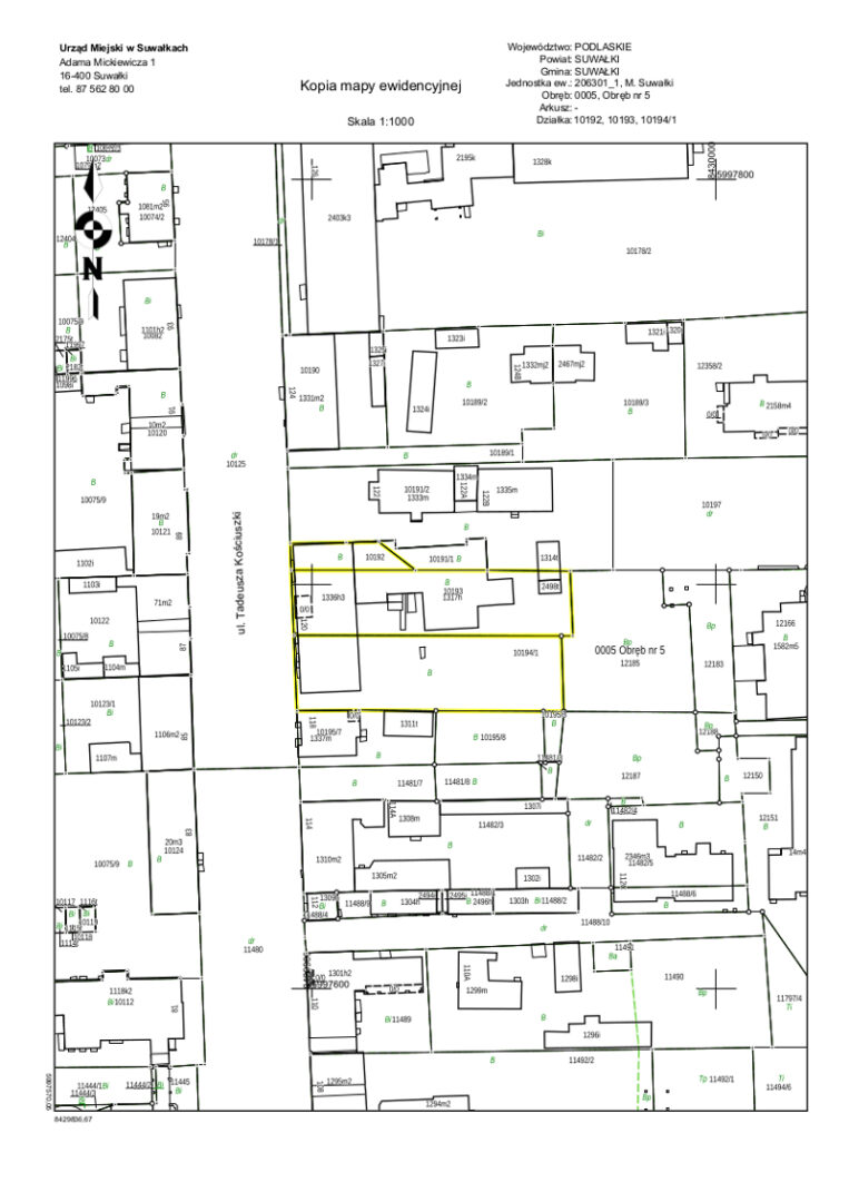 Nieruchomość zabudowana, stanowiąca własność Skarbu Państwa oznaczona w ewidencji gruntów jako działka nr 10192 o powierzchni 0,0180 ha, nr 10193 o powierzchni 0,1110 ha i nr 10194/1 o powierzchni 0,1226 ha, położona przy ul. Tadeusza Kościuszki 120 w Suwałkach, posiadająca urządzoną księgę wieczystą nr SU1S/00002800/5.