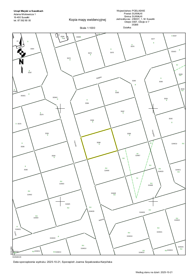 oznaczona działką nr 35388 o powierzchni 0,0853 ha, niezabudowana, położona w Suwałkach w Obrębie nr 7, wchodząca w skład nieruchomości oznaczonej księgą wieczystą nr SU1S/00031671/3. Działka zgodnie z miejscowym planem zagospodarowania przestrzennego południowo – zachodniego rejonu ulicy Zastawie w Suwałkach zatwierdzonym Uchwałą LXVI/871/2024 Rady Miejskiej w Suwałkach z dnia 31.01.2024 roku, objęta jest konturem 11MNW – teren zabudowy mieszkaniowej jednorodzinnej wolnostojącej. Nieruchomość przeznaczona jest do sprzedaży w drodze przetargu ustnego nieograniczonego.