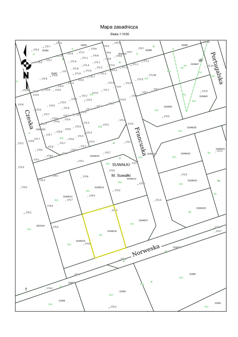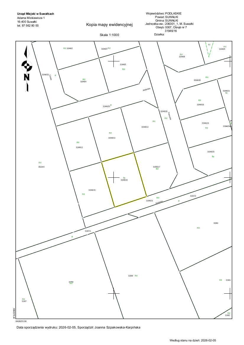 oznaczona działką nr 31946/16 o powierzchni 0,1159 ha, niezabudowana, położona w Suwałkach w Obrębie nr 7, wchodząca w skład nieruchomości oznaczonej księgą wieczystą nr SU1S/00031671/3. Działka zgodnie z miejscowym planem zagospodarowania przestrzennego południowo – zachodniego rejonu ulicy Zastawie w Suwałkach zatwierdzonym Uchwałą LXVI/871/2024 Rady Miejskiej w Suwałkach z dnia 31.01.2024 roku, objęta jest konturem 6MNW – teren zabudowy mieszkaniowej jednorodzinnej wolnostojącej. Nieruchomość przeznaczona jest do sprzedaży w drodze przetargu ustnego nieograniczonego.