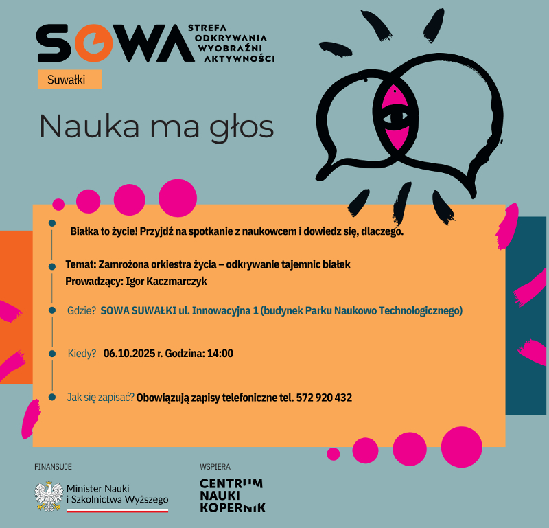 Już w najbliższy poniedziałek (6.10) spotkanie z Igorem Kaczmarczykiem pt. „Zamrożona orkiestra życia – odkrywanie tajemnic białek”. Na co dzień SOWA zaprasza mieszkańców do samodzielnego eksperymentowania, udziału w warsztatach i odkrywania praw rządzących światem przy naszych stacjach badawczych. Teraz, dzięki współpracy z Kopernikiem i Ministerstwem Nauki i Szkolnictwa Wyższego, rozwijamy naszą ofertę o nowy, wyjątkowy cykl spotkań z naukowcami i naukowczyniami.