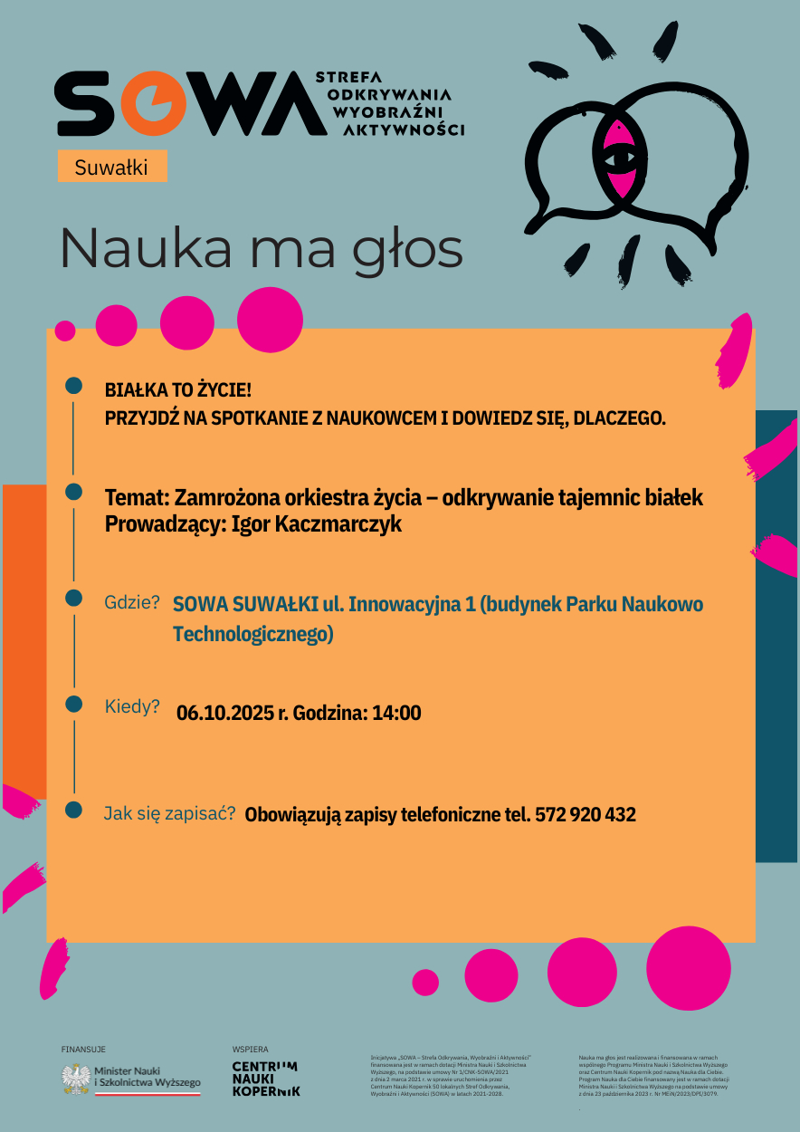 Już w najbliższy poniedziałek (6.10) spotkanie z Igorem Kaczmarczykiem pt. „Zamrożona orkiestra życia – odkrywanie tajemnic białek”. Na co dzień SOWA zaprasza mieszkańców do samodzielnego eksperymentowania, udziału w warsztatach i odkrywania praw rządzących światem przy naszych stacjach badawczych. Teraz, dzięki współpracy z Kopernikiem i Ministerstwem Nauki i Szkolnictwa Wyższego, rozwijamy naszą ofertę o nowy, wyjątkowy cykl spotkań z naukowcami i naukowczyniami.