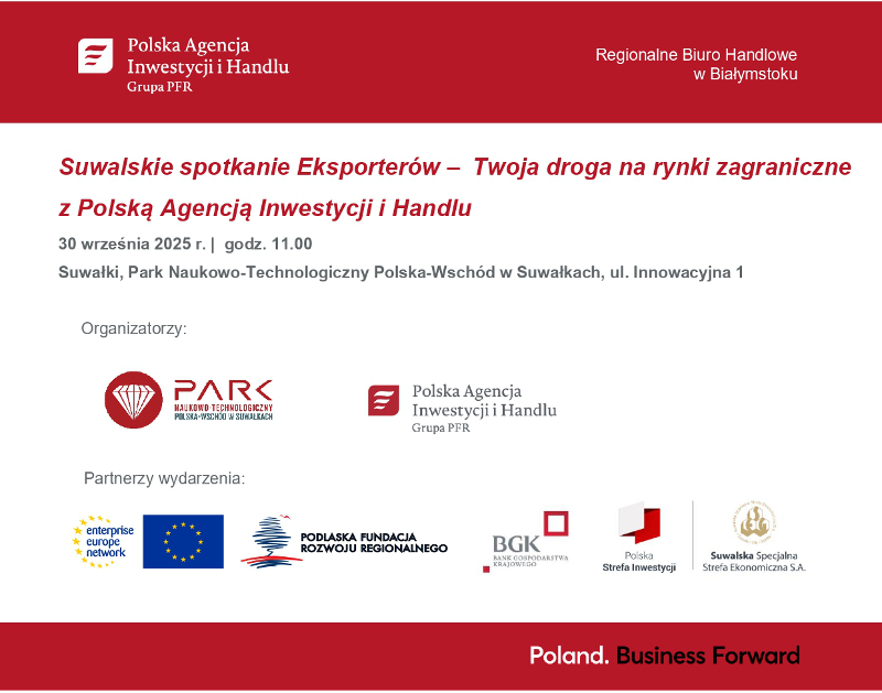 Park Naukowo-Technologiczny Polska-Wschód w Suwałkach we współpracy z Polską Agencją Inwestycji i Handlu (PAIH) zaprasza przedsiębiorców z regionu na Suwalskie Spotkanie Eksporterów – Twoja droga na rynki zagraniczne, które odbędzie się 30 września 2025 r.