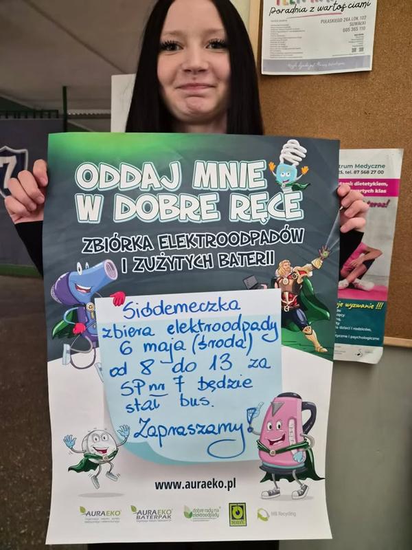 W Szkole Podstawowej nr 7 w Suwałkach trwa akcja ekologiczna „Siódemeczka zbiera elektroodpady”, realizowana w ramach ogólnopolskiego konkursu AURAEKO „Dobre Rady na Elektroodpady – Oddaj Mnie w Dobre Ręce”.