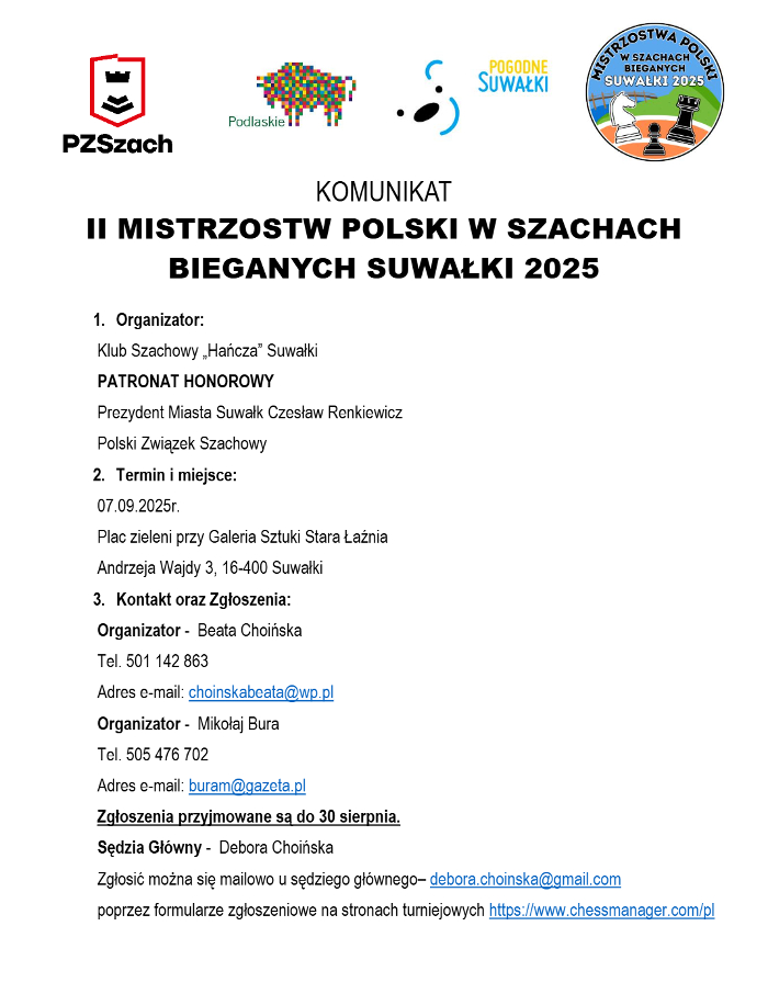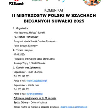 Klub Szachowy „Hańcza” Suwałki zaprasza do udziału w Mistrzostwach Polski w Szachach Bieganych, które odbędą się 7 września na Bulwarach, start godz. 8.30.