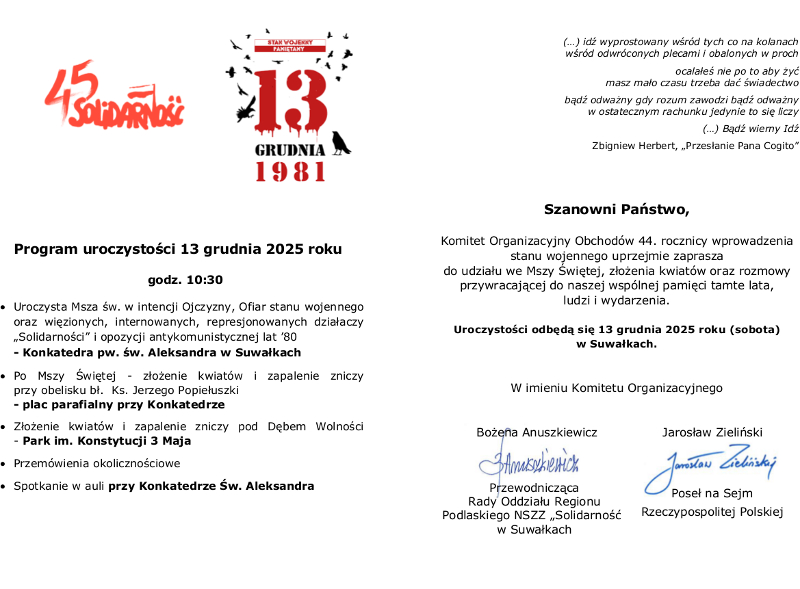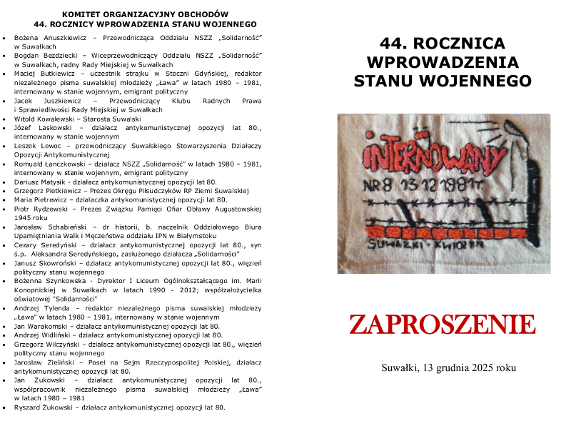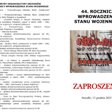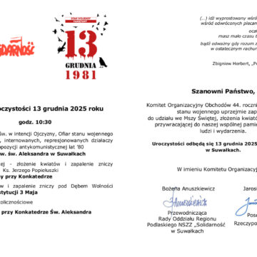 Organizatorzy zapraszają na obchody 44 rocznicy wprowadzenia stanu wojennego, które odbędą się 13 grudnia 2025 roku (sobota) o godz. 10:30 w Suwałkach.