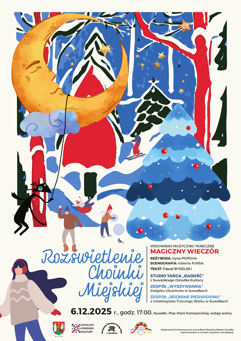Prezydent Miasta Suwałk, Suwalski Ośrodek Kultury oraz Stowarzyszenie Związek Ukraińców w Suwałkach zapraszają mieszkańców miasta, gości oraz najmłodszych suwalczan na wyjątkowe wydarzenie inaugurujące świąteczny czas w mieście – Rozświetlenie Choinki Miejskiej, połączone z prezentacją niezwykłego spektaklu „Magiczny Wieczór”.